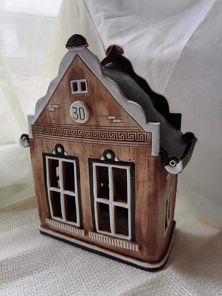 Domeček na přání vyrobený k jubileu, celková šířka 21 cm, základna 18 cm, výška cca 30 cm.