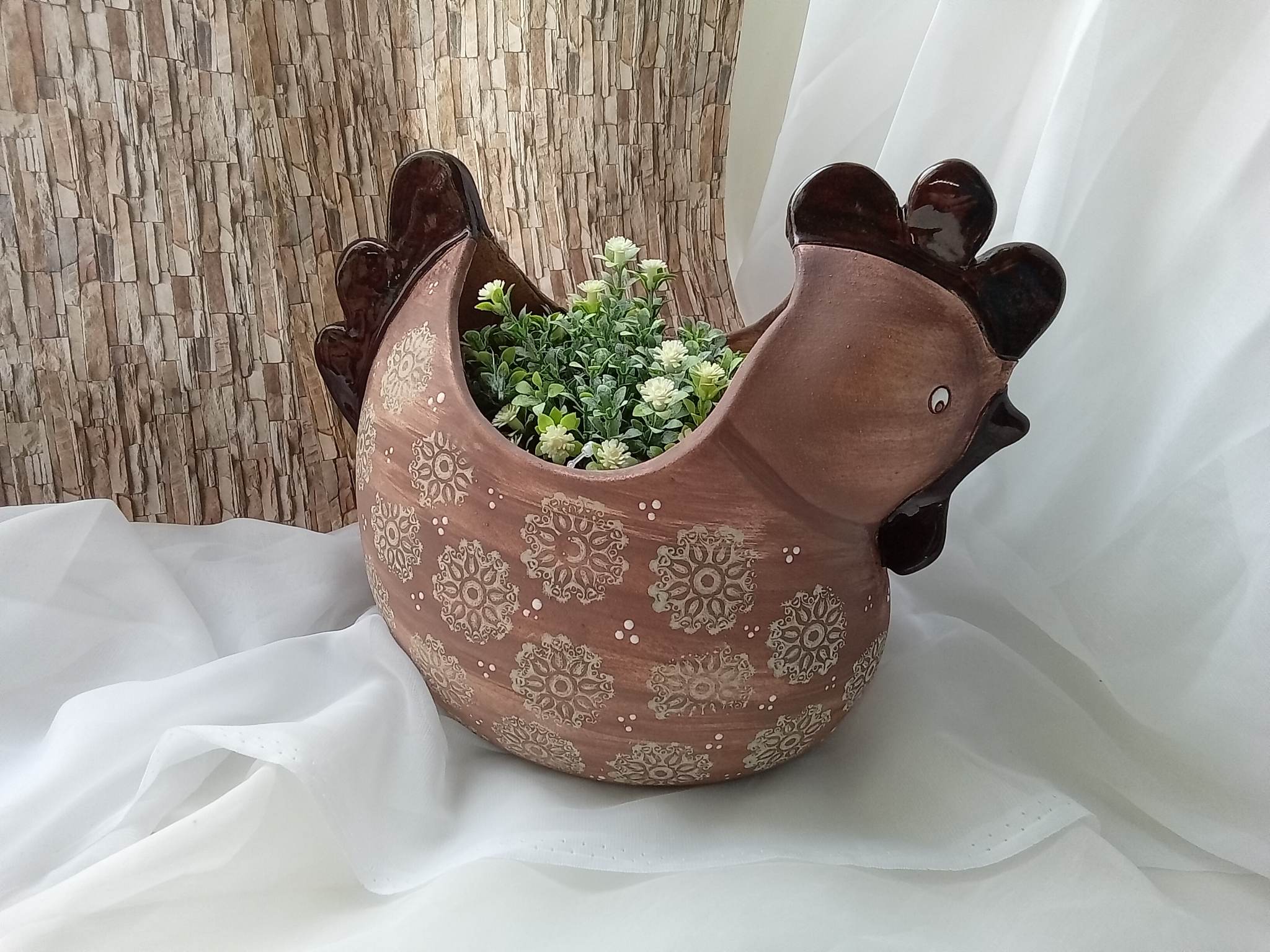 Keramická slepička vhodná k dekorativním účelům. Výběr dle momentální nabídky nebo na objednávku. Výška cca 20 cm, šířka cca 22 cm. Lze vložit květníček průměr cca 8-9 cm.