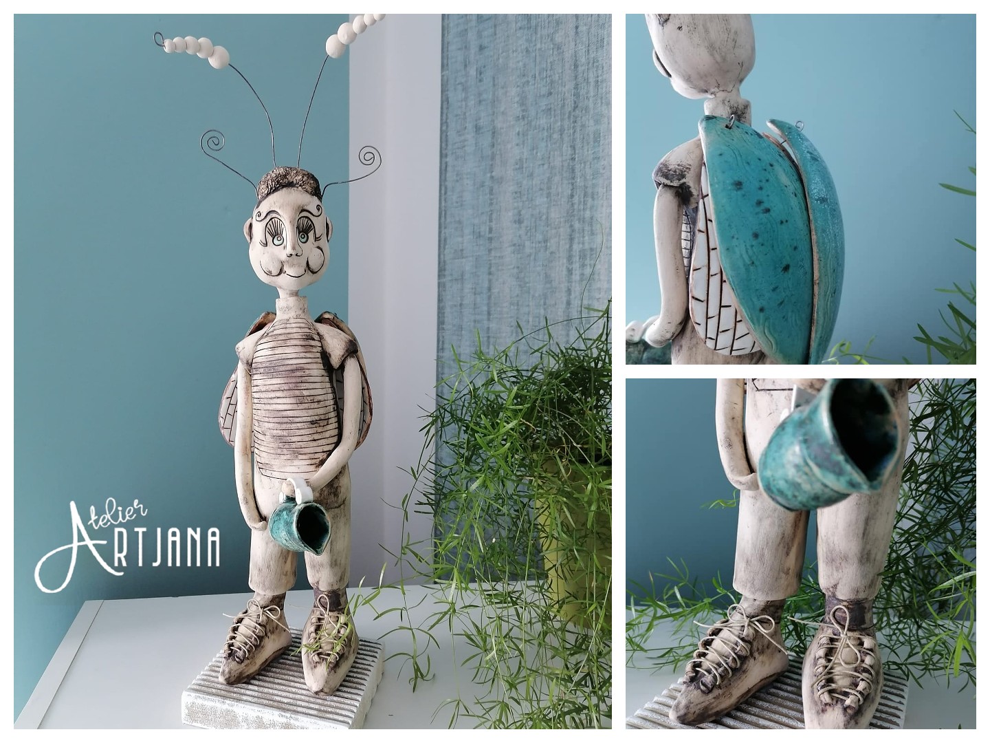 Keramická ručně modelovaná postava, pologlaz, výška včetně tykadel a podstavce cca 40 cm.